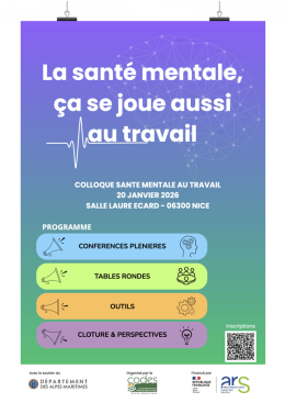 Le Comité Départemental d’Éducation pour la Santé des Alpes-Maritimes (CoDES 06) organise un colloque sur le thème : « La santé mentale, ça se joue aussi au travail ! », le mardi 20 janvier 2026 à Nice.